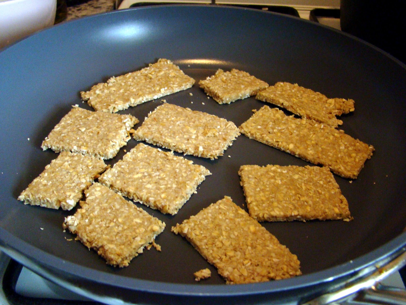 - Ar asu instrumentu, līdzīgu kā špakteļa lāpstiņu, ņem gabaliņus un liek sakarsētā pannā cepties. 'Taukvielas nekādas nevajag. Cep apmēram 5 min. un tad pagriež uz otru pusi un pacep vēl nedaudz. Pārcept nevajadzētu, tad tās sanāks sausas un negaršīgas.
